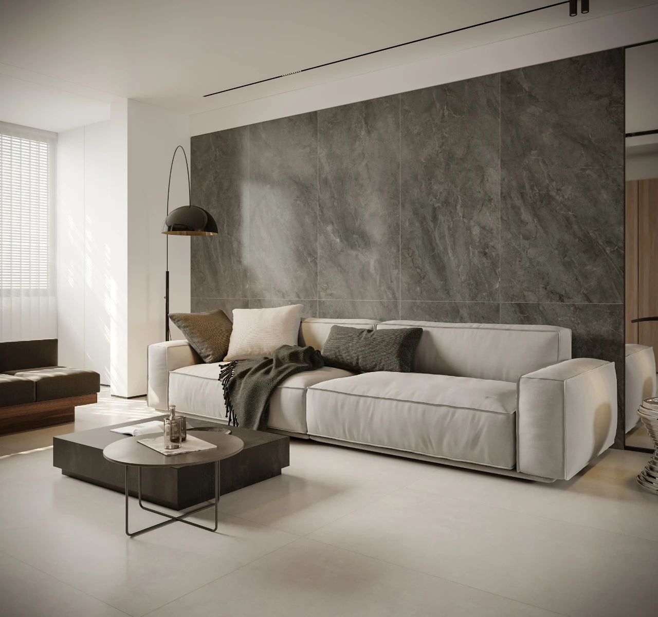 在卧室的设计上,除了强调视觉感受之外,更应该重视静谧的居住生活感受。卧室选用的是亚细亚瓷砖的全能世纪石古巴海浪灰,其质感由地面向室内延伸,在家具的呈现中更贴近居住者的日常生活。