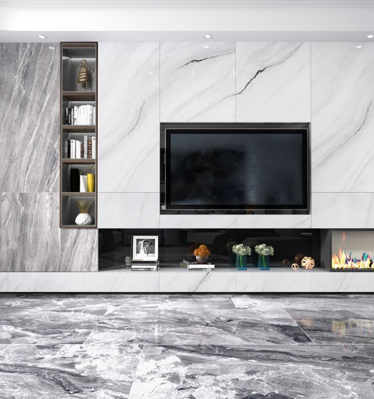 该背景墙选材于意大利北部Bergamo(贝尔格蒙)山脉中的Orobico (奥比克)大理石材。其矿脉纹理犹如卧山踞龙,贵不可言,整体纹理气势磅礴,暗藏龙气,寓意龙腾四方、吉祥如意。