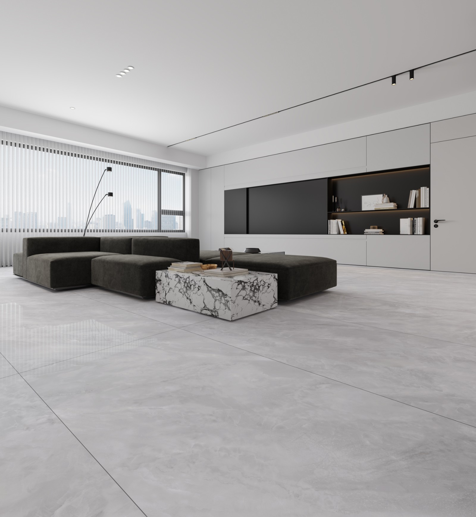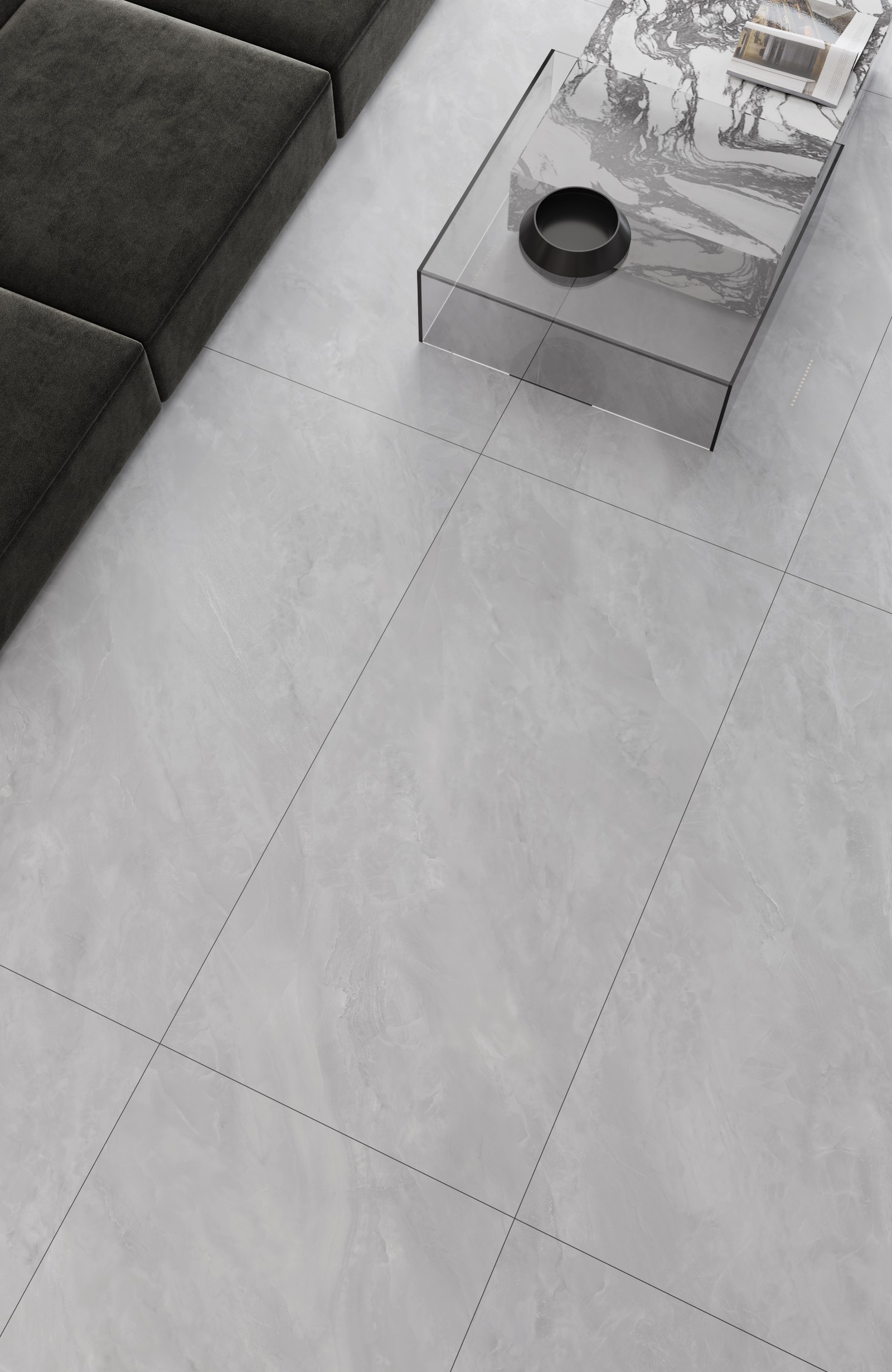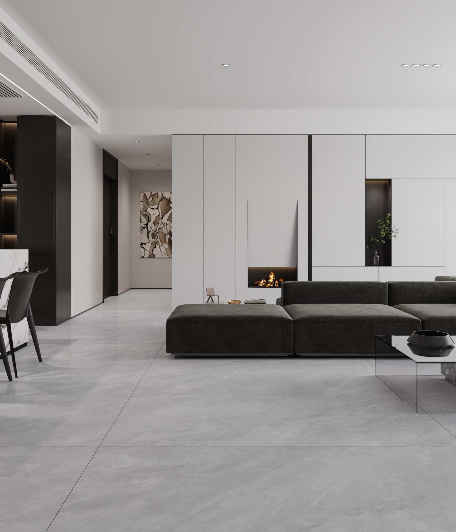 以灰白色淡雅的烟雨灰为主色调,搭配若隐若现的白色云雾壮纹理,砖面光洁细腻,触感温润如玉,