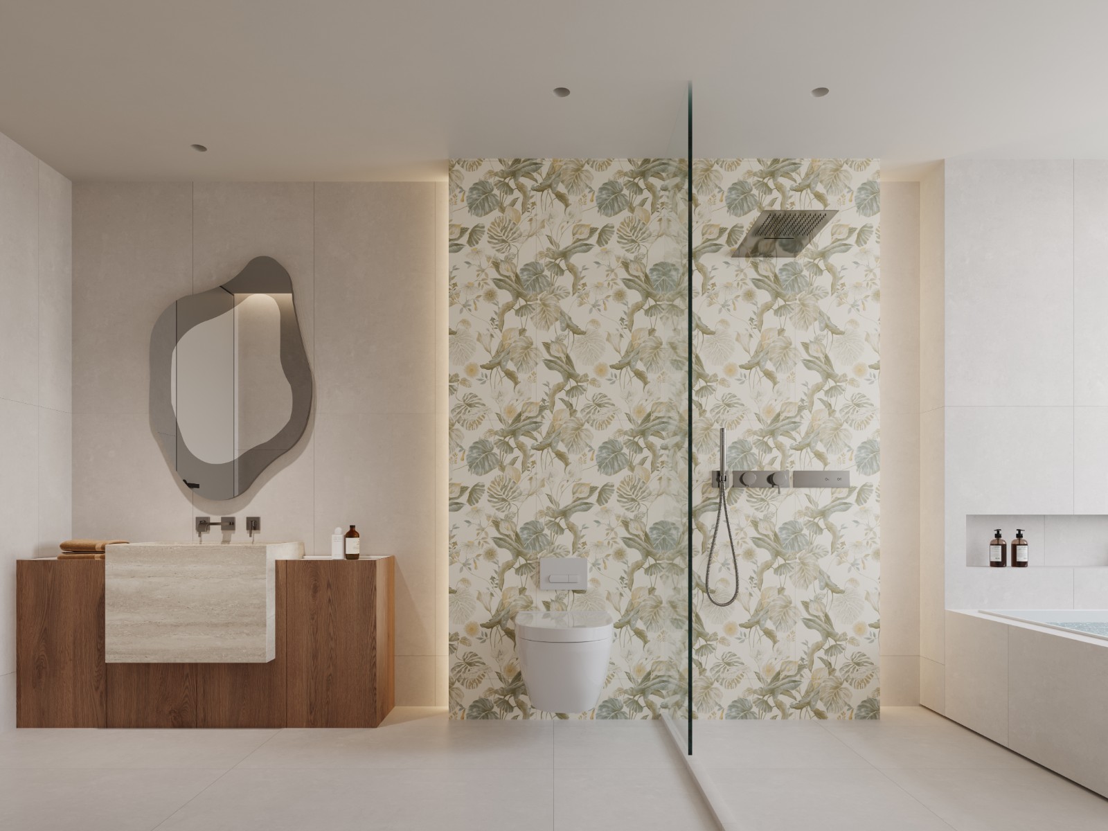 "流动花园”的设计灵感源自四季花园中花卉的盛开与凋零,以及花园中生命力的流动。我们试图将这种自然的流动与变化融入花色之中,让每一块瓷砖都成为花园的一部分,流动着生命的韵律。将大自然的美丽与和谐带入室内空间,让人们在繁忙的生活中也能感受到大自然的宁静与惬意,感受着大自然的生命力与美好。