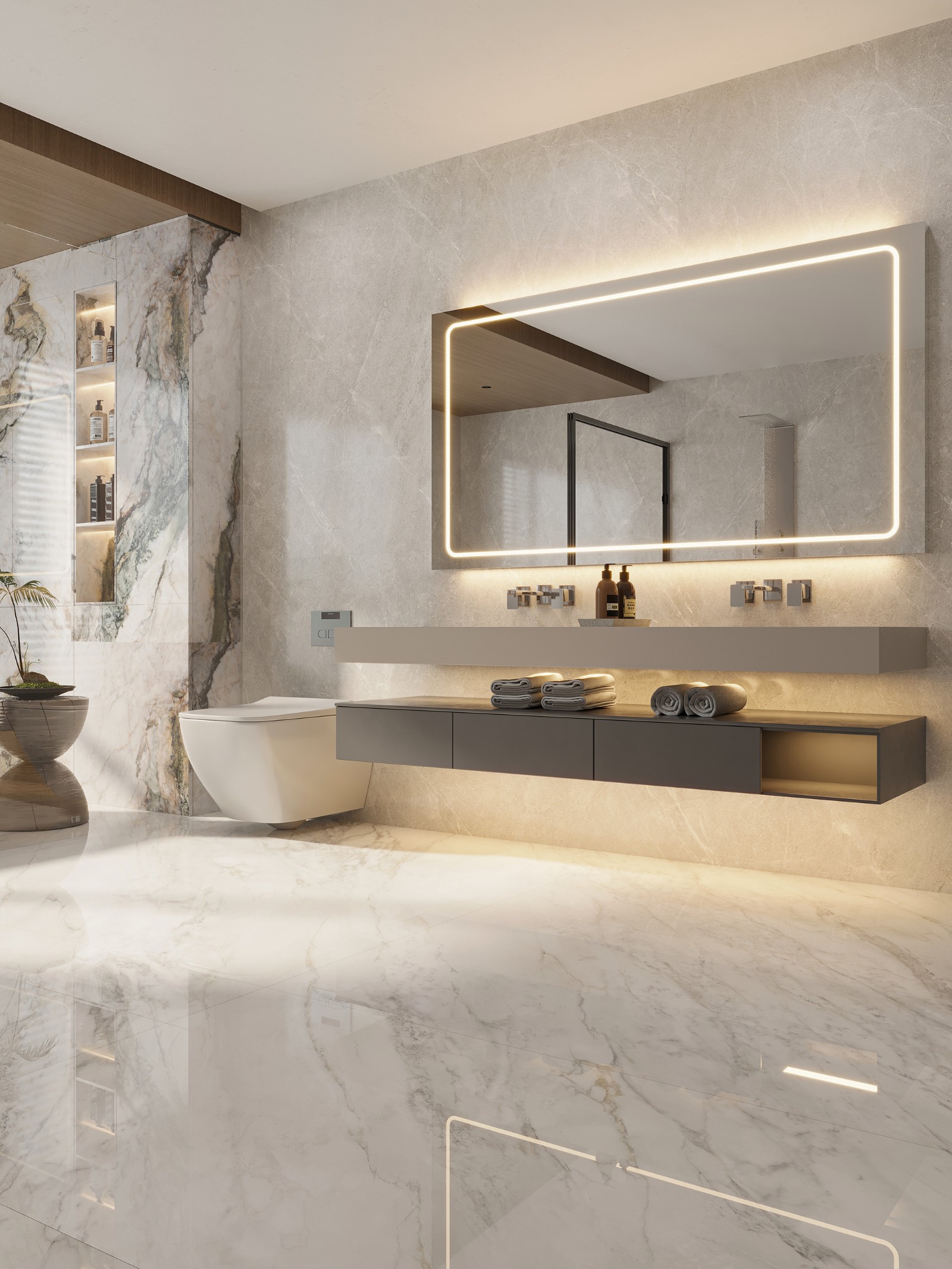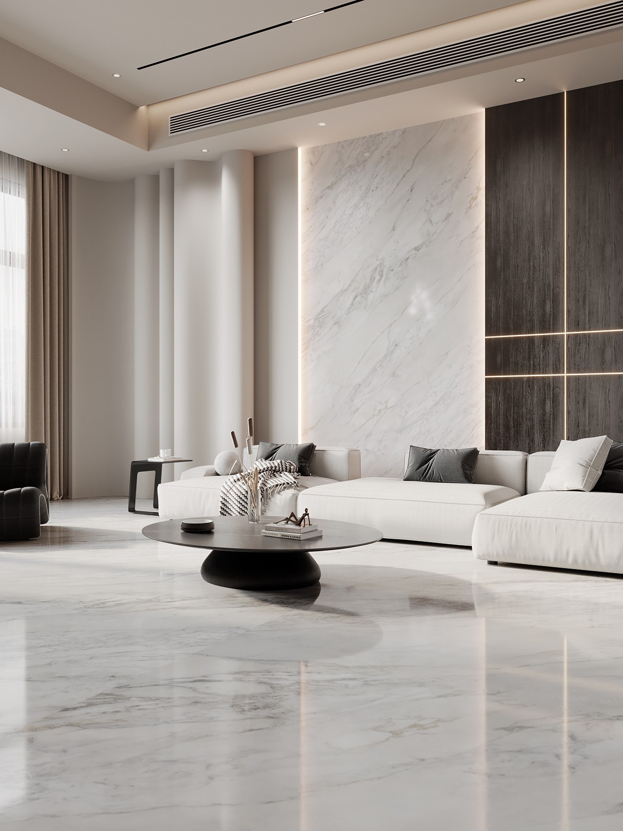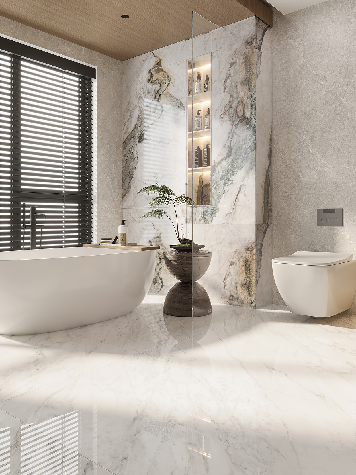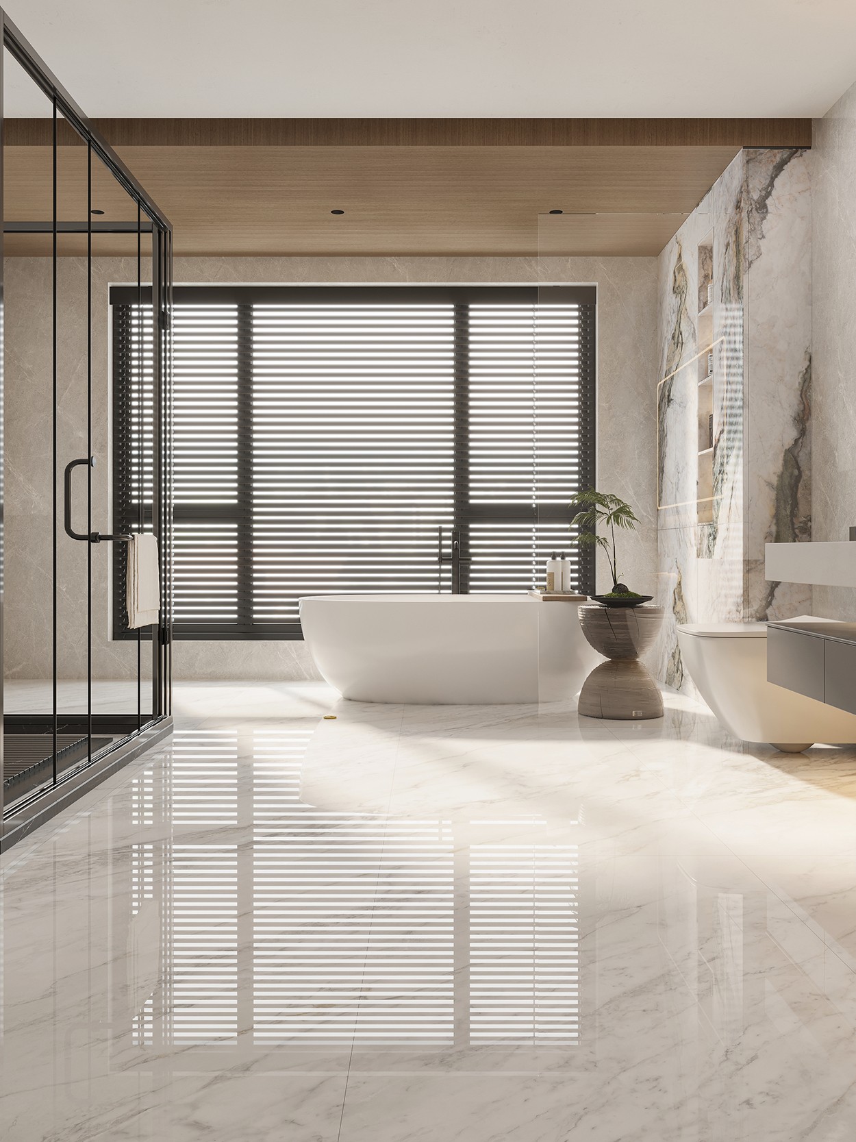 设计灵感来源于乌尤尼盐沼的云海,当 阳光洒在这片无垠的镜面上,云朵在天 空与地面之间自由游走,形成一幅流动 的画卷。我们捕捉了这一瞬的宁静与和 谐,将云海的轻盈与天空的深邃融入瓷 砖设计。每一片瓷砖都如同天空之镜, 反射出室内的光影,为您的空间带来一 份宁静与深远.